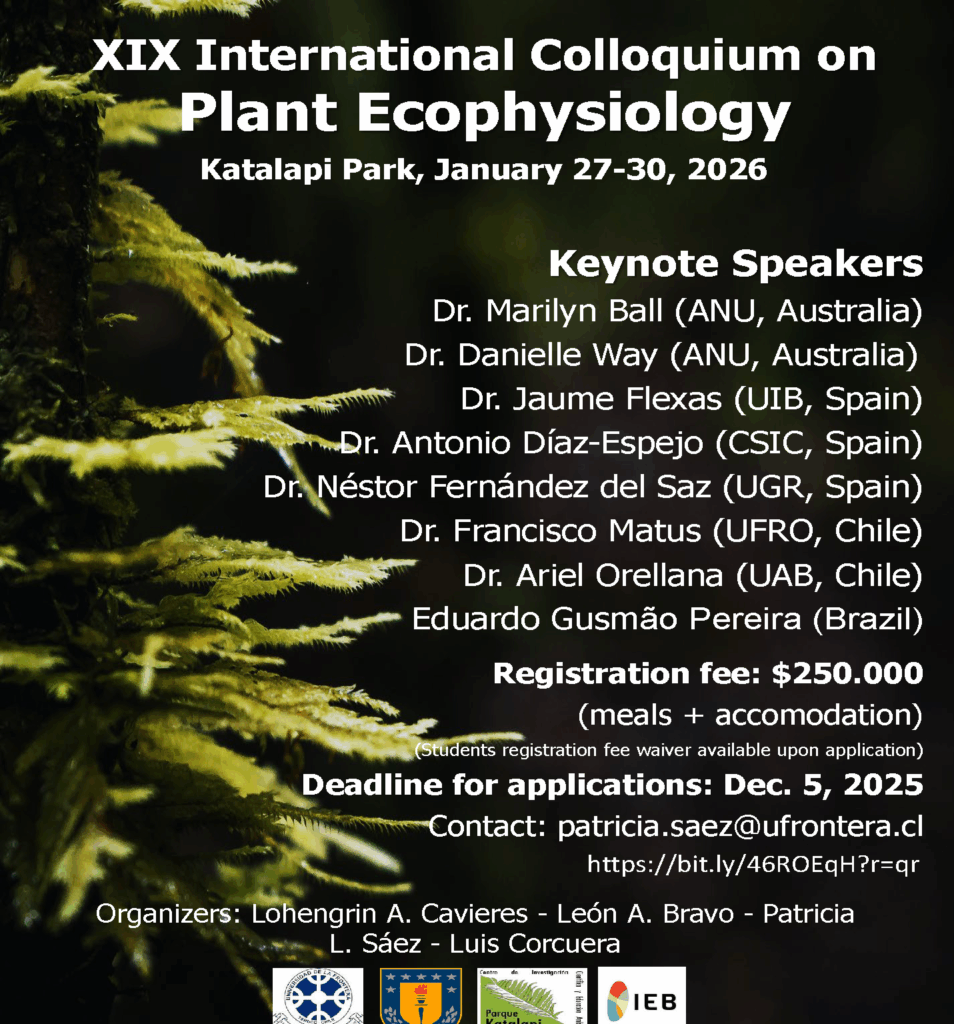 We would like to invite you to the “XIX version of the International Colloquium on Plant Ecophysiology ” this will be held in Katalapi (Puerto Montt) between January 27 and 31, 2026. This event is a unique instance for graduate students, young and established researchers, to share their scientific advances, in a relaxed environment, and conducive to the establishment of new collaborations. As usual, this year we will have the presence of important international researchers on Plan Ecophysiology: Marilyn Ball (ANU, Australia); Danielle Way (ANU, Australia), Jaume Flexas (UIB, Spain), Antonio Díaz-Espejo (CSIC-Spain), Nestor Fernandez del SAZ (UGR, Spain) Eduardo Gusmao Pereira (Brazil).